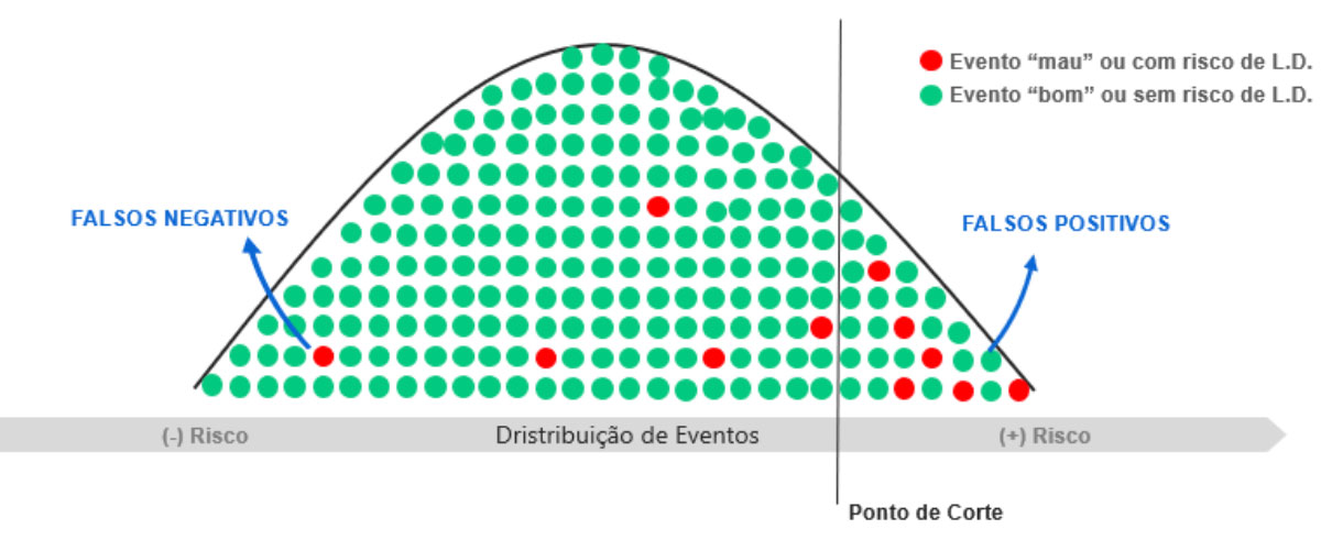 Pela figura 1, nota-se que há eventos de risco representados pela cor vermelha e eventos de não risco representados pela cor verde. Nesta ilustração, a distribuição hipotética de eventos indica que quanto mais à direita, maior será a probabilidade de o indivíduo apresentar o risco de lavagem de dinheiro. Definido um ponto de corte (que particiona a distribuição de acordo com a sugestão do pesquisador), é possível avaliar quantos indivíduos estarão classificados corretamente e erroneamente em cada partição. Por suposição, se esperarmos que um ponto de corte seja perfeito e separe a distribuição entre indivíduos “bons” e “maus”, então todos os pontos em vermelhos deveriam estar à direita e os pontos em verde à esquerda dessa distribuição.