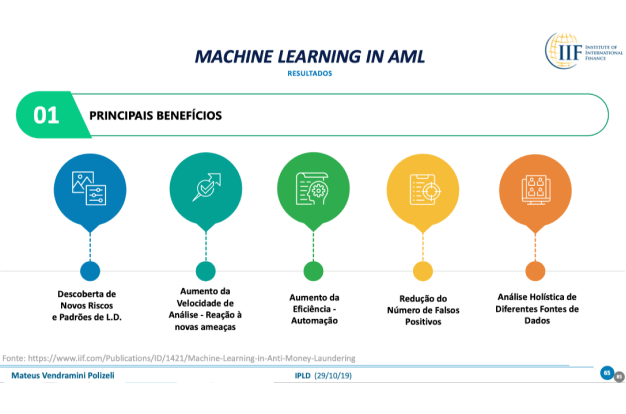 O Institute of International Finance (IFF) realizou, em 2018, uma pesquisa com 59 instituições (54 bancos e 5 seguradoras) [aqui] sobre a exploração e adoção de técnicas de Machine Learning no combate à lavagem de dinheiro.