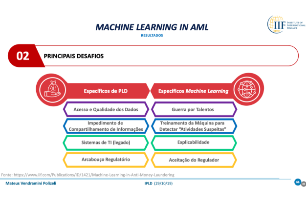 Como produtos do relatório do IIF, os autores descrevem que a pesquisa indica que a aplicação de técnicas de aprendizado de máquina em PLD está se espalhando rapidamente pela indústria, impulsionada pela dedicação em construir um sistema de defesa mais forte e eficaz contra atividades ilícitas. Significativamente, nenhuma das 59 empresas pesquisadas buscava o aprendizado de máquina como um meio de reduzir a equipe, mas sim para obter insights maiores e mais rápidos que podem ser disponibilizados para seus especialistas de PLD.