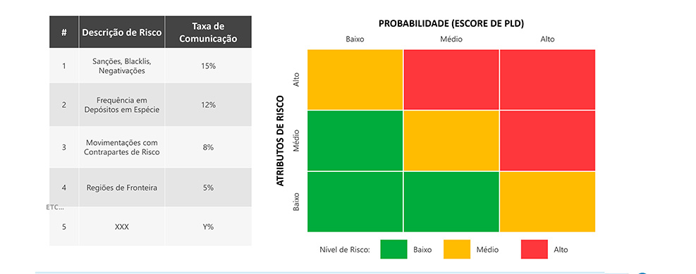 A partir da análise dos dados, os especialistas de PLD podem construir uma matriz de decisão, ou seja, determinar uma combinação entre o risco de modelos e demais atributos de risco de lavagem de dinheiro. Para isso, é preciso determinar os parâmetros e atributos quanto a sua gravidade e a probabilidade de ocorrência em escore de PLD.
